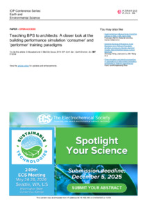 This contribution builds upon a previous study, in which three university-level BPS training paradigms were identified. Using a critical literature review, we focus on two of these; training the ‘consumer’ and ‘performer’ architect, exploring similarities and differences between teaching approaches of these two paradigms. Divergences are found in the location of BPS teaching content within the wider scope of architectural program delivery. The ‘consumer’ paradigm is generally followed in undergraduate architectural education, tends to be taught as an elective module and is almost always linked to a design studio component. The ‘performer’ paradigm is linked to both undergraduate and postgraduate architectural education, is mostly affixed to stand-alone core technical modules and is sometimes attached to the design studio. Similar BPS performance domains are taught across both paradigms, but the rationale underlying BPS tool selection differs. Visualization capabilities and ease-of-learning tend to be the criteria used to justify selection of BPS tools used in articles describing the ‘performer’ paradigm. On the other hand, assignment of BPS tasks to an ‘expert’ under the ‘consumer’ paradigm allows for software with more complex analytical functions to be selected. To conclude, the findings demonstrate how moving beyond descriptions of individualized teaching experimentations in BPS research, toward cross-paradigmatic studies of BPS education, may contribute to the construction of a much-needed foundation to support BPS teaching in the future.