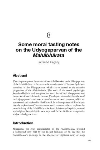 This chapter explores the ways in which moral decisions are taken by people in positions of power and influence in the Sanskrit Mahābhārata, which I characterize as acts of public reason. It focuses on the moral content of the courtly debates contained in the Mahābhārata, which are so central to the narrative progression of the text. The paper pursues a universalist line of enquiry, which considers the moral foundations of the back and forth of negotiations in the Udyogaparvan of the Mahābhārata (its fifth book). This universalist approach develops after the work of the evolutionary psychologist and theorist of religion and politics, Jonathan Haidt. I demonstrate the utility of his approach to the analysis of the Mahābhārata as a globally significant text.