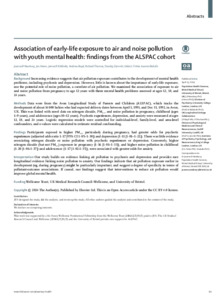 Background: Increasing evidence suggests that air pollution exposure contributes to the development of mental health problems, including psychosis and depression. However, little is known about the importance of early-life exposure, nor the potential role of noise pollution, a correlate of air pollution. We examined the association of exposure to air and noise pollution from pregnancy to age 12 years with three mental health problems assessed at ages 12, 18, and 24 years. Methods: Data were from the Avon Longitudinal Study of Parents and Children (ALSPAC), which tracks the development of about 14 000 babies who had expected delivery dates between April 1, 1991, and Dec 31, 1992, in Avon, UK. This was linked with novel data on nitrogen dioxide, PM2·5, and noise pollution in pregnancy, childhood (ages 1–9 years), and adolescence (ages 10–12 years). Psychotic experiences, depression, and anxiety were measured at ages 12, 18, and 24 years. Logistic regression models were controlled for individual-level, family-level, and area-level confounders, and e-values were calculated to estimate residual confounding. Findings: Participants exposed to higher PM2.5, particularly during pregnancy, had greater odds for psychotic experiences (adjusted odds ratio 1·17 [95% CI 1·05–1·30]) and depression (1·11 [1·01–1·22]). There was little evidence associating nitrogen dioxide or noise pollution with psychotic experiences or depression. Conversely, higher nitrogen dioxide (but not PM2·5) exposure in pregnancy (1·16 [1·01–1·33]), and higher noise pollution in childhood (1·20 [1·06-1·37]) and adolescence (1·17 [1·02-1·35]), were associated with greater odds for anxiety. Interpretation: Our study builds on evidence linking air pollution to psychosis and depression and provides rare longitudinal evidence linking noise pollution to anxiety. Our findings indicate that air pollution exposure earlier in development (eg, during pregnancy) might be particularly important, and suggest a degree of specificity in terms of pollutant-outcome associations. If causal, our findings suggest that interventions to reduce air pollution would improve global mental health.