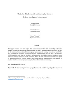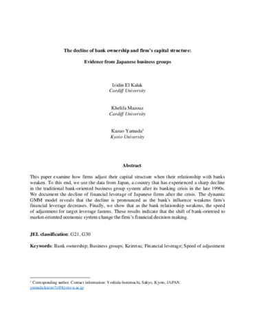 This paper examine how firms adjust their capital structure when their relationship with banks weaken. To this end, we use the data from Japan, a country that has experienced a sharp decline in the traditional bank-oriented business group system after its banking crisis in the late 1990s. We document the decline of financial leverage of Japanese firms after the crisis. The dynamic GMM model reveals that the decline is pronounced as the bank’s influence weakens firm’s financial leverage decreases. Finally, we show that as the bank relationship weakens, the speed of adjustment for target leverage fastens. These results indicate that the shift of bank-oriented to market-oriented economic system change the firm’s financial decision making.