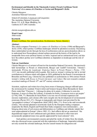 Environment and identity in the nineteenth-century French Caribbean novel: Traversay's Les amours de Zémédare et Carina and Bergeaud's Stella.