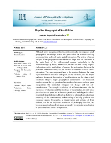 Although rarely recognised, Hegelian philosophy also encompasses a rich geographical knowledge, which has great value for scholars working across multiple scales of socio-spatial interaction. The article offers an analysis of the geographical sensibilities of Hegel that are immanent in the main body of his philosophical system, particularly in the Phenomenology of Spirit, where it is possible to find a very original elaboration on the metabolism of reason, the articulation between the particular and the universal, and the function of otherness in socio-spatial interaction. The main argument here is the contrast between the more explicit references to nature and space, on the one hand, and the deeper and more immanent theorisation of world relations, on the other, which constitutes Hegel’s major geographical contribution. The discussion revolves around the key question of the totality of relations and how space encapsulates the unfinished struggles for change and for self-consciousness. The complex evolution of self-consciousness, via the experience of otherness and the insistence of moral duties, not only takes place in time and space but is also an expression of socially produced and perennially disputed spaces. Hegelian dialectic is ultimately an anticipated rendering of the contemporary understanding of socially produced and contested spaces. Geography, as interpretation and critique of lived realities, can be an important translation of philosophy into life, but because space is always lived space, geography becomes the actualisation of philosophy and also its complication.