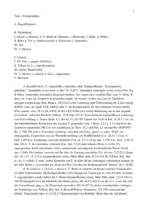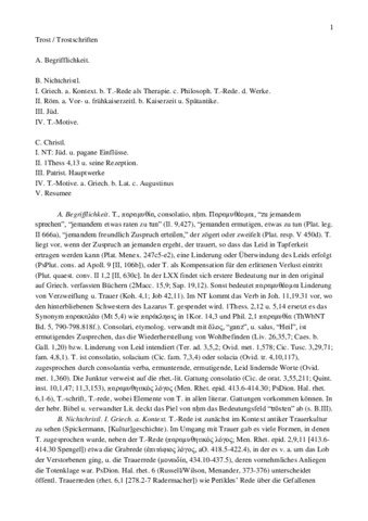This article sets out main strands of research on ancient consolation (and consolatory literature). It explains the relevant terminology (A.) and discusses first the non-Christian (B.) and then the Christian tradition (C.), before offering a conclusion (D.). The non-Christian section comprises Greek, Roman and Jewish literature, and a section on consolatory motifs. The Christian section is divided into New Testament (I.), 1 Thessalonians 4:13 and its reception (II.), the major works of the Patristic tradition (III.), and consolatory motifs in the Greek and Latin tradition (IV.). The conclusion includes some remarks on the reception of the ancient consolatory tradition down to the end of the 19th century.