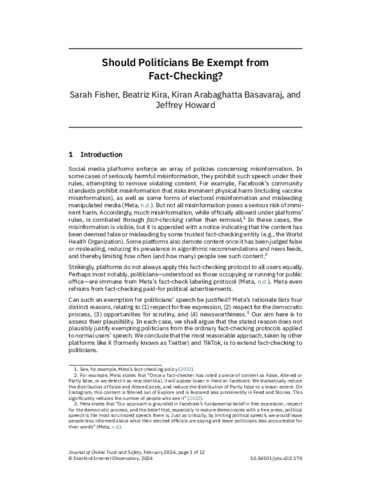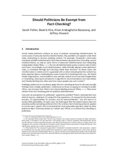 Social media platforms enforce an array of policies concerning misinformation. Insome cases of seriously harmful misinformation, they prohibit such speech under theirrules, attempting to remove violating content. For example, Facebook’s communitystandards prohibit misinformation that risks imminent physical harm (including vaccinemisinformation), as well as some forms of electoral misinformation and misleadingmanipulated media (Meta,n.d. ). But not all misinformation poses a serious risk of immi-nent harm. Accordingly, much misinformation, while officially allowed under platforms’rules, is combated throughfact-checkingrather than removal.1In these cases, themisinformation is visible, but it is appended with a notice indicating that the content hasbeen deemed false or misleading by some trusted fact-checking entity (e.g., the WorldHealth Organization). Some platforms also demote content once it has been judged falseor misleading, reducing its prevalence in algorithmic recommendations and news feeds,and thereby limiting how often (and how many) people see such content.2Strikingly, platforms do not always apply this fact-checking protocol to all users equally.Perhaps most notably, politicians—understood as those occupying or running for publicoffice—are immune from Meta’s fact-check labeling protocol (Meta,n.d. ). Meta evenrefrains from fact-checking paid-for political advertisements.Can such an exemption for politicians’ speech be justified? Meta’s rationale lists fourdistinct reasons, relating to(1) respect for free expression,(2) respect for the democraticprocess,(3) opportunities for scrutiny, and(4) newsworthiness.3Our aim here is toassess their plausibility. In each case, we shall argue that the stated reason does notplausibly justify exempting politicians from the ordinary fact-checking protocols appliedto normal users’ speech. We conclude that the most reasonable approach, taken by otherplatforms like X (formerly known as Twitter) and TikTok, is to extend fact-checking to politicians