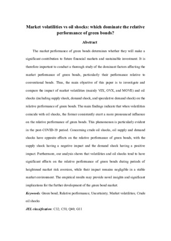 The market performance of green bonds determines whether they will make a significant contribution to future financial markets and sustainable investment. It is therefore important to conduct a thorough study of the dominant factors affecting the market performance of green bonds, particularly their performance relative to conventional bonds. Thus, the main objective of this paper is to investigate and compare the impact of market volatilities (mainly VIX, OVX, and MOVE) and oil shocks (including supply shock, demand shock, and speculative demand shock) on the relative performance of green bonds. The main findings indicate that when volatilities coincide with oil shocks, the former consistently exert a more pronounced influence on the relative performance of green bonds. This phenomenon is particularly evident in the post-COVID-19 period. Concerning crude oil shocks, oil supply and demand shocks have opposite effects on the relative performance of green bonds, with the supply shock having a negative impact and the demand shock having a positive impact. Furthermore, our analysis shows that volatilities and oil shocks tend to have significant effects on the relative performance of green bonds during periods of heightened market risk aversion, while their impact remains negligible in a stable market environment. The empirical results may provide novel insights and significant implications for the further development of the green bond market.