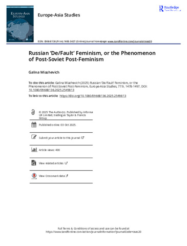 Miazhevich, Galina ORCID: https://orcid.org/0000-0001-9233-7097 2024. Russian ‘de/fault’ feminism, or the phenomenon of post-Soviet post-feminism. Europe-Asia Studies 77 (9) , pp. 1478-1497. 10.1080/09668136.2025.2549813