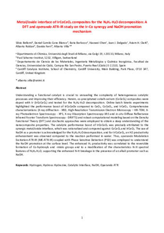 Understanding the structure of a functional catalyst is crucial to disclosing the complexity of heterogeneous processes and improving their efficiency. Herein, coprecipitated cobalt–ceria (CoCeOx) oxides doped with Ir (IrCoCeOx) were synthesized and used to assess the performances of metal/oxide interfaces in the N2H4·H2O decomposition performed in aqueous NaOH. Kinetic experiments in batch showed that CoO is the active phase of CoCeOx and that the copresence of Ir and Co (IrCoCeOx) enhanced H2 productivity. A comprehensive characterization (X-ray diffraction, transmission electron microscopy, X-ray photoelectron spectroscopy (XPS), X-ray absorption spectroscopy, and in situ diffuse reflectance infrared Fourier transform spectroscopy) combined with robust computational modeling based on the density functional theory was employed to attribute the IrCoCeOx performance enhancement to the Ir/CoO metal/oxide interface, the active site of the reaction. On these sites, the improved H2 productivity in the presence of aqueous NaOH was studied operando through modulated excitation-attenuated total reflectance infrared coupled with phase sensitive detection. The formation of surface Co-hydroxyl and -imido groups at the Ir/CoO interface induced the preferential breakage of the N–H bond of N2H4·H2O, favoring the production of H2.