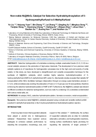 | Liu, Ye, Yuan, Haiyang, Zhang, Bin, Zhang, Lei, Xu, Qingling, Dong, Minghua, Wang, Tianjiao, Cheng, Xiaomeng, Qi, Haifeng, Zhao, Zhijuan, Chen, Lihua, Su, Baolian, Han, Buxing and Liu, Huizhen 2024. Non-noble Ni@NbOx Catalyst for Selective Hydrodehydroxylation of 5-Hydroxymethylfurfural to 5-Methylfurfural. ACS Sustainable Chemistry and Engineering 12 (44) , pp. 16202-16211. 10.1021/acssuschemeng.4c04684 |