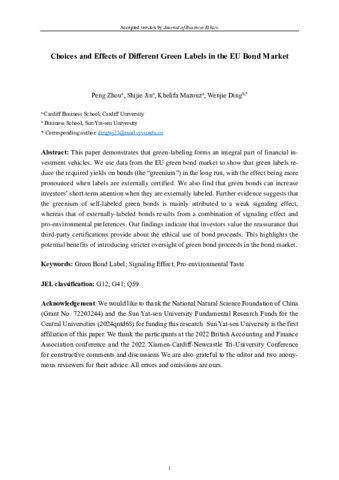 This paper demonstrates that green-labeling forms an integral part of financial investment vehicles. We use data from the EU green bond market to show that green labels reduce the required yields on bonds (the “greenium”) in the long run, with the effect being more pronounced when labels are externally certified. We also find that green bonds can increase investors’ short-term attention when they are externally labeled. Further evidence suggests that the greenium of self-labeled green bonds is mainly attributed to a weak signaling effect, whereas that of externally labeled bonds results from a combination of signaling effect and pro-environmental preferences. Our findings indicate that investors value the reassurance that third-party certifications provide about the ethical use of bond proceeds. This highlights the potential benefits of introducing stricter oversight of green bond proceeds in the bond market.