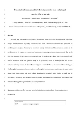 Numerical study on mean and turbulent characteristics of an oscillating jet under the effect of currents.