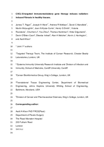 CXCL12-targeted immunomodulatory gene therapy reduces radiation-induced fibrosis in healthy tissues.