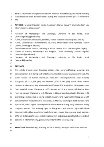 | Di Giusto, Marina, Herrscher, Estelle, Jaouen, Klervia, Bastos, Murilo, Mion, Leïa and Wesolowski, Veronica 2025. Early childhood in precolonial South America: breastfeeding, infant mortality, and stable isotopes analysis in Southeastern shell mound builders during the Middle Holocene (7th–5th millennium BP). International Journal of Osteoarchaeology 35 (1) , e3381. 10.1002/oa.3381 |
