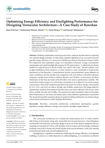 Building optimisation techniques provide a rigorous framework for exploring new optimal design solutions. In this study, a genetic algorithm (GA) was used to investigate the energy efficiency of a vernacular architectural element (Rawshan) in Saudi Arabia. Two objectives were optimised using a GA simulation enhanced: energy consumption optimisation and useful daylight illuminance (UDI) optimisation. A calibrated simulation model of a typical house in Saudi Arabia was used in the study. Several metrics, such as light interference from shadows or other windows, were considered to indicate the importance of the Rawshan. Computational studies were performed using different climatic conditions, and the results were compared with and without a Rawshan element using the weather data of Mecca, Jeddah, Riyadh, and Al-Baha. In this study, the blind thicknesses on the front and sides of the Rawshan were used as optimisation variables. The results showed that using a GA with energy consumption as an objective can reduce energy consumption. One of the methods proposed in the paper can reduce energy consumption by 3.6%, 3.6%, and 16.6% for Mecca, Riyadh, and Al-Baha, respectively. The single-objective optimisation method demonstrated that Rawshan provided sufficient UDI in four cities: Mecca, Jeddah, Riyadh, and Al-Baha. The research provided optimised values for Rawshan blind thicknesses on the front and lateral sides under different optimisation constraints. The results showed that using Rawshans in modern building architecture can reduce energy consumption and improve useful daylight illuminance.