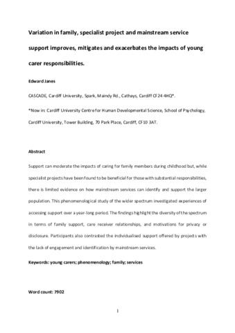 Support can moderate the impacts of caring for family members during childhood, but while specialist projects have been found to be beneficial for those with substantial responsibilities, there is limited evidence on how mainstream services can identify and support the larger population. This phenomenological study of the wider spectrum investigated experiences of accessing support over a year-long period. The findings highlight the diversity of the spectrum in terms of family support, care-receiver relationships and motivations for privacy or disclosure. Participants also contrasted the individualised support offered by projects with the lack of engagement and identification by mainstream services.