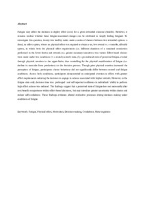 Fatigue may affect the decision to deploy effort (cost) for a given rewarded outcome (benefit). However, it remains unclear whether these fatigue-associated changes can be attributed to simply feeling fatigued. To investigate this question, twenty-two healthy males made a series of choices between two rewarded options: a fixed, no effort option, where no physical effort was required to obtain a set, low reward vs. a variable, effortful option, in which both the physical effort requirements (i.e. different durations of a sustained contraction performed in the lower limbs) and rewards (i.e. greater monetary incentives) was varied. Effort-based choices were made under two conditions: (1) a rested (control) state, (2) a pre-induced state of perceived fatigue, evoked through physical exertion in the upper-limbs, thus controlling for the physical manifestation of fatigue (i.e. decline in muscular force production in the lower limbs) on the decision process. Though prior physical exertion increased the perception of fatigue, participants choices did not significantly differ between control and fatigue conditions. Across both conditions, participants demonstrated an anticipated aversion to effort, with greater effort requirements reducing the decision to engage in actions associated with higher rewards. However, in the fatigue state only, decision time was prolonged and self-reported confidence in individuals' ability to perform high effort actions was reduced. The findings suggest that a perceived state of fatigue does not necessarily alter cost/benefit comparisons within effort-based decisions, but may introduce greater uncertainty within choice and reduce self-confidence. These findings evidence altered evaluative processes during decision making under conditions of fatigue. [Abstract copyright: Copyright © 2024. Published by Elsevier Inc.]