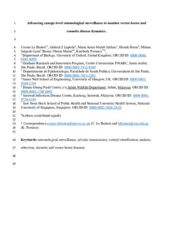 | Le Breton, Cosmo, Laporta, Gabriel Z., Sallum, Maria Anice Mureb, Hesse, Henrik, Salgado Lynn, Milena, Manin, Benny Obrain and Fornace, Kimberly 2025. Advancing canopy-level entomological surveillance to monitor vector-borne and zoonotic disease dynamics. Trends in Parasitology 41 (2) , pp. 150-161. 10.1016/j.pt.2024.12.009 |