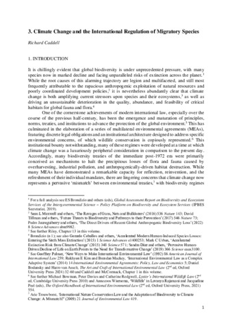 Migratory species face an array of conservation threats that will be steadily compounded by the impacts of global climate change. Internationally, migratory species are most directly protected under the Convention on the Conservation of Migratory Species of Wild Animals (CMS), adopted in 1979. Climate change had yet to enter the multilateral consciousness at the time at which the treaty was elaborated. This chapter considers how the CMS regime has subsequently adapted to address the impacts of climate change on the many species under its regulatory purview. This chapter first considers the key conservation threats posed to migratory species, before examining the extent to which the CMS and its subsidiary instruments have prescribed climate change obligations and how these policies have evolved in recent decades as this threat has received greater traction under its sprawling regulatory auspices. This chapter accordingly focuses upon the core elements of climate policy that have emerged under the CMS regime, which may be primarily identified as scientific evaluation and coordination, habitat fragmentation and conservation, mitigating the impacts of renewable energy technologies upon migratory species, and collaboration with other regimes to foster cooperative strategies in the promotion of this mandate.