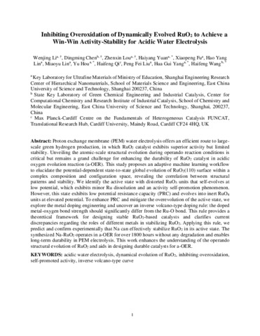 | Li, Wenjing, Chen, Dingming, Lou, Zhenxin, Yuan, Haiyang, Fu, Xiaopeng, Lin, Hao Yang, Lin, Miaoyu, Hou, Yu, Qi, Haifeng, Liu, Peng Fei, Yang, Hua Gui and Wang, Haifeng 2025. Inhibiting overoxidation of dynamically evolved RuO2 to achieve a win–win in activity–stability for acidic water electrolysis. Journal of the American Chemical Society 147 (12) , pp. 10446-10458. 10.1021/jacs.4c18300 |