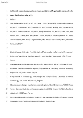 | Ghelfenstein-Ferreira, Théo, Cuypers, Lize, Pinto, Anaïs, Desoubeaux, Guillaume, Friaza, Vicente, Fuchs, Stefan, Halliday, Catriona, Gal, Solène Le, Scharmann, Ulrike, Steinmann, Joerg, Totet, Anne, Zhang, Sean X., Cruciani, Mario, Barnes, Rosemary, Donnelly, J Peter, Loeffler, Juergen, White, P. Lewis and Alanio, Alexandre 2025. Multicentric prospective evaluation of Pneumocystis jirovecii fungal load in bronchoalveolar lavage fluid fractions using qPCR. Medical Mycology 63 (3) , myaf023. 10.1093/mmy/myaf023 |
