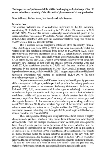 The importance of professional skills within the changing media landscape of the UK screen industries: a case study of the ‘disruptive’ phenomenon of virtual production.