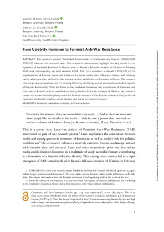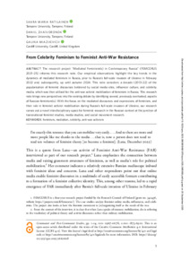 The research project “Mediated Feminism(s) in Contemporary Russia” (FEMCORUS 2021–25) informs this research note. Our empirical observations highlight the key trends in the dynamics of mediated feminism in Russia, prior to Russia’s full-scale invasion of Ukraine in February 2022 and, subsequently, up until autumn 2024. This note considers a decade (2013–22) of the popularization of feminist discourses bolstered by social media sites, influencer culture, and celebrity media, which was then utilized for the anti-war activist mobilization of feminism in Russia. This research note brings new perspectives into the existing debate by identifying several, previously overlooked, aspects of Russian feminism(s). With the focus on the mediated discourses and expressions of feminism, and their role in feminist activist mobilization during Russia’s full-scale invasion of Ukraine, our research carves out a novel interdisciplinary space for feminist research in the Russian context at the junction of transnational feminist studies, media studies, and social movement research.