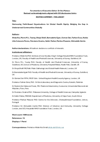 | Ala, Aftab, Touray, Morro M.L., Shafi, Shuja, Egan, Bernadette, Dar, Osman, Essa, Farhan, Flores, Nubia L.C., Ocama, Ponsiano, Parker, Salim, Maeurer, Markus and Zumla, Alimuddin 2025. Harnessing faith-based organisations for global health equity. The Lancet 405 (10472) , pp. 10-13. 10.1016/S0140-6736(24)02614-X |