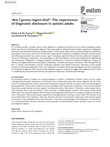 An increasing number of people receive autism diagnoses in adulthood, and there are few studies investigating autistic adults’ experiences of disclosing their diagnosis. This study sought to understand autistic adults’ experiences of diagnostic disclosure using interpretative phenomenological analysis. Twelve autistic adults, who received their diagnosis in adulthood, participated in one-to-one semi-structured interviews exploring their experiences of diagnostic disclosure. Quality control and reflexivity procedures were used to ensure rigour. Four group experiential themes and nine subthemes emerged: (1) ‘Functions of Disclosure’ (subthemes: i. Accessing Support; ii. Becoming Myself; iii. Activism and its Burden); (2) ‘Approaching the Conversation’ (Subthemes: i. Managing Disclosure and Reactions; ii. Disclosure Started Pre-Diagnosis; iii. Impact on Others); (3) ‘Negative Effects of Preconceptions’ (Subthemes: i. Disbelief and Imposter Syndrome; ii. Not Having My Needs Met; iii. Caution and Avoidance), and (4) ‘Acceptance, Openness and Finding Community’. Disclosure served multiple functions for the autistic participants. There was variability in the support that autistic participants received in preparation for disclosing the diagnosis. More consistent post-diagnostic support is required to engage newly diagnosed autistic adults in considering the practicalities and potential consequences of disclosure, its benefits and challenges.