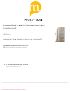 In the mid-1970s, the Black American writer, filmmaker, teacher, and activist Kathleen Collins (1942–1988) drafted the first four chapters of a novel titled “Blue Obstacles” in a composition book held at the Schomburg Center for Research in Black Culture. It is likely that this draft material constitutes the only known trace of Collins’s first novel, which was later titled “Treatment for a Colored Movie.” Extending recent efforts to disseminate and properly value Collins’s work across mediums and genres, edited excerpts from the first two chapters of “Blue Obstacles” are reproduced and contextualized here. The accompanying essay draws on Collins’s correspondence and other literary and cinematic work to situate this project within her oeuvre. In addition to offering a rare insight into Collins’s writing practices in its exploratory phases, “Blue Obstacles” is part of a constellation of texts which demonstrate Collins’s practices of working through and with her memories in various fictional genres, particularly in the decade from around 1974. In this respect, the unfinished novel offers a model—and impetus—for Black feminist archival scholarship committed to, in Collins’s words, “writing the guts out of the past.”