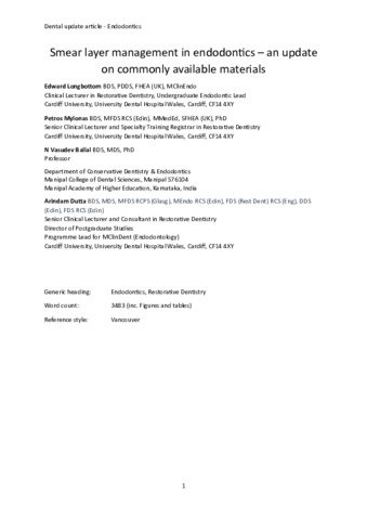 The smear layer is a thin layer of tooth tissue, bacteria and infected dentine that is intimately attached to the wall of root canals. It is created during any instrumentation of the root canal and inhibits microbe removal from dentine tubules and intimate attachment of endodontic sealer, which necessitates its removal. A variety of materials for removal of the smear layer is available: this article discusses the different types and makes general recommendations on the treatment of the smear layer and the use of chelating agents in endodontic treatment. CPD/Clinical Relevance: Removal of the smear layer is necessary for thorough disinfection of the root canal system and for the predictable healing of apical periodontitis.