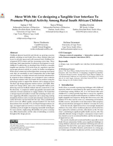 Move with me: co-designing a tangible user interface to promote physical activity among rural South African children.