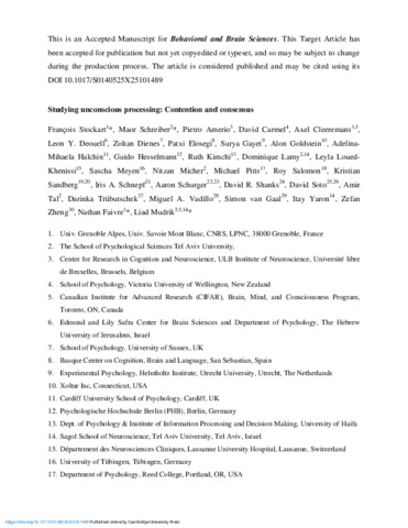 | Stockart, François, Schreiber, Maor, Amerio, Pietro, Carmel, David, Cleeremans, Axel, Deouell, Leon Y., Dienes, Zoltan, Elosegi, Patxi, Gayet, Surya, Goldstein, Alon, Halchin, Adelina-Mihaela, Hesselmann, Guido, Kimchi, Ruth, Lamy, Dominique, Loued-Khenissi, Leyla, Meyen, Sascha, Micher, Nitzan, Pitts, Michael, Salomon, Roy, Sandberg, Kristian, Schnepf, Iris A., Schurger, Aaron, Shanks, David R., Soto, David, Tal, Amir, Trübutschek, Darinka, Vadillo, Miguel A., van Gaal, Simon, Yaron, Itay, Zheng, Zefan, Faivre, Nathan and Mudrik, Liad 2025. Studying unconscious processing: Contention and consensus. Behavioral and Brain Sciences 10.1017/S0140525X25101489 |