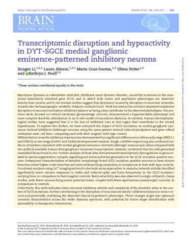 Transcriptomic disruption and hypoactivity in DYT-SGCE medial ganglionic eminence-patterned inhibitory neurons.