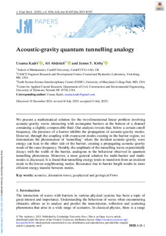 We present a mathematical solution for the two-dimensional linear problem involving acoustic-gravity waves interacting with rectangular barriers at the bottom of a channel containing a slightly compressible fluid. Our analysis reveals that below a certain cut-off frequency, the presence of a barrier inhibits the propagation of acoustic-gravity modes. However, through the coupling with evanescent modes existing in the barrier region, we demonstrate the phenomenon of “tunnelling” where the incident acoustic-gravity wave energy can leak to the other side of the barrier creating a propagating acoustic-gravity mode of the same frequency. Notably, the amplitude of the tunnelling waves exponentially decays with the width of the barrier, analogous to the behaviour observed in quantum tunnelling phenomena. Moreover, a more general solution for multi-barrier, and multi-modes is discussed. It is found that tunnelling energy tends to transform from an incident mode to the lowest neighbouring modes. Resonance due to barrier length results in more efficient energy transfer between modes.