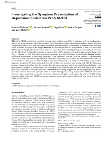 Objective: ADHD is commonly comorbid with depression and this comorbidity is associated with increased symptom severity and worse outcomes than either condition alone. Depression is highly heterogeneous and may present differently in populations with ADHD. This study aimed to explore different symptom presentations of depression and associated clinical correlates in a clinical ADHD sample. Method: We analysed data from the Study of ADHD Genes and Environment (SAGE). Parents completed semi-structured interviews about their child’s psychopathology at baseline (Mage = 10.9 years) and the Mood and Feelings Questionnaire to capture their child’s depression symptoms approximately 5 years later (Mage = 14.6 years, N = 246). Depression symptom presentations were derived by latent profile analysis. Results: Analyses found three presentations of depression symptoms: a ‘low symptoms’ class (48.5% of the sample), a ‘high symptoms’ class (15.5%) with consistently high depression symptoms, particularly for suicidality and poor self-esteem items, and an ‘irritable/poor sleep’ class (36.1%) with high scores for irritability and poor sleep and intermediate levels of other depression symptoms. All three classes had elevated irritability and symptoms that overlap with ADHD. Behavioural problems (oppositional defiant disorder; conduct disorder) were associated with an increased likelihood of being in the high symptoms compared to low symptoms class, and higher autism symptoms were associated with being in the ‘irritable/poor sleep’ compared to low symptoms class. Conculsion: Our findings suggest that while young people with ADHD often have elevated depression symptoms, there is notable heterogeneity. Young people with ADHD and behavioural disorders may be particularly at risk of a more severe depression symptom presentations characterised by high suicidal cognitions, whilst those with ADHD and autistic traits may present with more irritability and poor sleep.