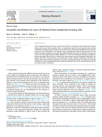 A bone-conduction hearing aid delivers sound to both cochleae by vibrating the skull. Consequently, bilateral fitting results in poor stereo separation. Here, we demonstrate improved stereo separation using crosstalk cancellation in unimpaired listeners using two bone vibrators and in two patients with bilateral bone-conduction hearing aids. The crosstalk filters were calibrated using a psychophysical sound-lateralisation method and the benefit of crosstalk cancellation was assessed using masked thresholds when noise was presented to one side and a tone to the other. Improvements in masked threshold of ∼10 dB were demonstrated bilaterally in unimpaired listeners using digital filters typical of a clinical device. Improvements were also demonstrated bilaterally in one patient, albeit with a strong asymmetry, and unilaterally in another. Without recalibration of the filters, the patients’ improvements decreased gradually over successive experimental sessions. We conclude that crosstalk cancellation can be successfully implemented for bilaterally implanted users of bone-conduction hearing aids but may require periodic recalibration.