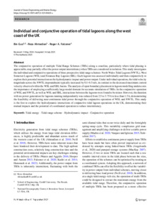 The conjunctive operation of multiple Tidal Range Schemes (TRSs) along a coastline, particularly where tidal phasing is appreciable, may partially offset the power output intermittency when TRSs are considered in isolation. This study investigates the individual and conjunctive operations of three prospective tidal range schemes: North Wales Tidal Lagoon (NWTL), West Somerset Lagoon (WSL) and Swansea Bay Lagoon (SBL). Each lagoon was assessed individually and then conjunctively to explore their potential interaction on the hydrodynamic impact and power output. Under individual operation, the tidal velocity magnitude across the NWTL impoundment typically increased by 0.1–0.5 m/s, in contrast to the decreased maximum current velocity observed within the WSL and SBL basins. The analysis of open boundary placement in lagoon modelling underscores the importance of employing a sufficiently large model domain for accurate simulation of TRSs. In the conjunctive operation of WSL and NWTL, as well as WSL and SBL, interactions between the lagoons were found to be minor. However, the duration with no power generation for lagoons running independently was reduced from 2.5 to 3.75 h to less than 1.5 h, demonstrating the feasibility of delivering near-continuous tidal power through the conjunctive operation of WSL and NWTL. This study is the first to explore the hydrodynamic interactions of conjunctive tidal lagoon operations in the UK, demonstrating their mutual impacts and the potential of coordinated operation to reduce intermittency.