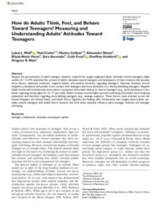 Despite the pervasiveness of adult-teenager relations, research has largely neglected adults’ attitudes towards teenagers. Eight studies (N=3,517) examined the content of adults’ attitudes towards teenagers and developed a 14-item measure that assesses three factors: openness intentions, negative beliefs, and positive emotions regarding teenagers. Openness intentions involve empathic orientations and predict more contact with teenagers and more donations to a charity benefitting teenagers. Negative beliefs involve self-oriented and conservative orientations and predict desires to control teenagers (e.g., social dominance orientation, opposing voting rights for 16-17 year olds). Positive emotions involve higher personal well-being and predict more forgiving evaluations and decisions regarding norm-defying teenagers (e.g., teenage suspects). These factors were invariant across the United Kingdom, United States, and South Africa. Together, the findings offer fundamental new insights about adults’ attitudes towards teenagers and enable future research into how these attitudes influence adult-teenager relations and teenager well-being.