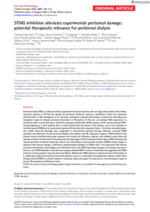 Peritoneal dialysis (PD) is a widely used kidney replacement therapy for patients with end‐stage kidney disease. Nevertheless, long‐term exposure to PD fluid can damage the peritoneal membrane, leading to ultrafiltration failure and, ultimately, discontinuation of PD. Investigation of the molecular mechanisms underlying this damage is essential for identifying new therapeutic targets to mitigate peritoneal deterioration in PD patients. To this end, we employed RNA sequencing in a preclinical model of peritoneal injury, induced by prolonged chlorhexidine (CHX) exposure, which revealed cytosolic DNA‐sensing signaling as a novel pathway. Next, we demonstrated that key players in this pathway, such as the stimulator of interferon genes (STING) and its downstream signaling effectors (interferon regulatory factor 3, interferon‐stimulated genes, and nuclear factor‐κB signaling), were upregulated in experimental peritoneal damage. Moreover, increased STING expression was observed in human peritoneal biopsies from patients with PD. Subsequent studies in STING‐deficient mice showed reduced proinflammatory gene expression and immune cell infiltration, together with inhibited nuclear factor‐κB pathway activation at both early (10 days) and late (30 days) stages of CHX‐induced peritoneal injury. STING deficiency also reduced peritoneal membrane thickening, fibrosis, and mesothelial‐to‐mesenchymal transition (MMT)‐related changes in advanced CHX‐induced damage. Furthermore, pharmacological inhibition of STING with C‐176 attenuated CHX‐induced peritoneal inflammation. Macrophages were identified as one of the STING‐expressing cell types in the injured peritoneum. Hence, in vitro STING blockade in activated macrophages inhibited MMT in cultured mesothelial cells, suggesting that STING activation in this population may drive peritoneal fibrosis. Additionally, STING deficiency reduced peritoneal inflammation in S. epidermidis‐induced peritonitis and decreased adhesion scores in a postsurgical intra‐abdominal adhesion model. These findings identify STING as a pivotal mediator of peritoneal injury and support its potential as a novel therapeutic target to prevent PD‐associated ultrafiltration failure. © 2025 The Author(s). The Journal of Pathology published by John Wiley & Sons Ltd on behalf of The Pathological Society of Great Britain and Ireland.