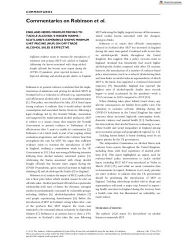 Commentary on Robinson et al.: England needs minimum pricing to tackle alcohol's hidden harms—Scotland's experience shows minimum unit pricing (MUP) on off-trade alcohol sales is effective.
