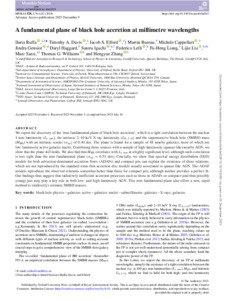 We report the discovery of the ‘mm fundamental plane of black hole accretion’, which is a tight correlation between the nuclear 1 mm luminosity (Lν, mm), the intrinsic 2–10 keV X-ray luminosity (LX, 2–10) and the supermassive black hole (SMBH) mass (MBH) with an intrinsic scatter (σint) of 0.40 dex. The plane is found for a sample of 48 nearby galaxies, most of which are low-luminosity active galactic nuclei. Combining these sources with a sample of high-luminosity (quasar-like) nearby AGN, we show that the plane still holds. We also find that MBH correlates with Lν, mm at a highly significant level, although such correlation is less tight than the mm fundamental plane (σint = 0.51 dex). Crucially, we show that spectral energy distribution (SED) models for both advection-dominated accretion flows (ADAFs) and compact jets can explain the existence of these relations, which are not reproduced by the standard torus-thin accretion disc models usually associated to quasar-like AGN. The ADAF models reproduces the observed relations somewhat better than those for compact jets, although neither provides a perfect fit. Our findings thus suggest that radiatively inefficient accretion processes such as those in ADAFs or compact (and thus possibly young) jets may play a key role in both low- and high-luminosity AGN. This mm fundamental plane also offers a new, rapid method to (indirectly) estimate SMBH masses.