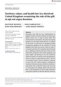 Devolution since 1998 has seen administrations in England, Northern Ireland, Scotland and Wales gain distinct powers over a range of policy fields, with health prominent among them. This poses two pressing questions for socio-legal scholarship which we address in this paper. To what extent are changing territorial arrangements significant for the substance of UK health law and the values by which it is oriented? And what role is played by devolved health law in re-defining territories and values within the UK? Informed by perspectives from geography and policy studies, and drawing on our own qualitative empirical research we examine recent law-making processes in relation to organ donation reform. ‘Opt-out’, or ‘presumed consent’, schemes, adopted in sequence in each of the UK countries, appear to challenge the centrality of voluntary altruism, extolled as a fundamentally British value in Richard Titmuss’s post-war work on social policy. Our findings confirm that there has been a re-territorialization of values under devolution, with greater emphasis on sub-state identities. But they also indicate the persistence of a common space of policy-learning across the UK and an enduring concern with altruism in this area.