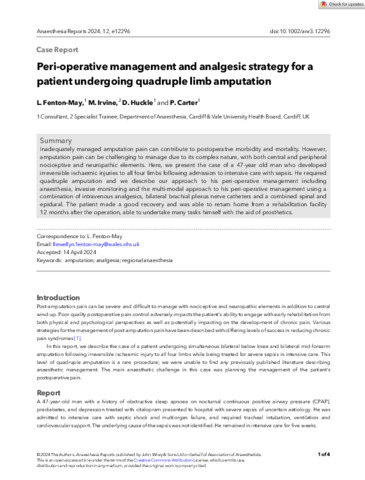 Inadequately managed amputation pain can contribute to postoperative morbidity and mortality. However, amputation pain can be challenging to manage due to its complex nature, with both central and peripheral nociceptive and neuropathic elements. Here, we present the case of a 47-year old man who developed irreversible ischaemic injuries to all four limbs following admission to intensive care with sepsis. He required quadruple amputation and we describe our approach to his peri-operative management including anaesthesia, invasive monitoring and the multi-modal approach to his peri-operative management using a combination of intravenous analgesics, bilateral brachial plexus nerve catheters and a combined spinal and epidural. The patient made a good recovery and was able to return home from a rehabilitation facility 12 months after the operation, able to undertake many tasks himself with the aid of prosthetics.