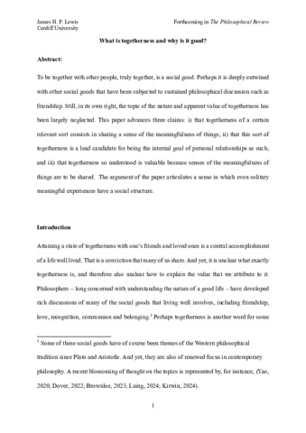 To be together with other people, truly together, is a social good. Perhaps it is deeply entwined with other social goods that have been subjected to sustained philosophical discussion such as friendship. Still, in its own right, the topic of the nature and apparent value of togetherness has been largely neglected. This paper advances three claims: i) that togetherness of a certain relevant sort consists in sharing a sense of the meaningfulness of things; ii) that this sort of togetherness is a lead candidate for being the internal goal of personal relationships as such; and iii) that togetherness so understood is valuable because senses of the meaningfulness of things are to be shared. The argument of the paper articulates a sense in which even solitary meaningful experiences have a social structure.