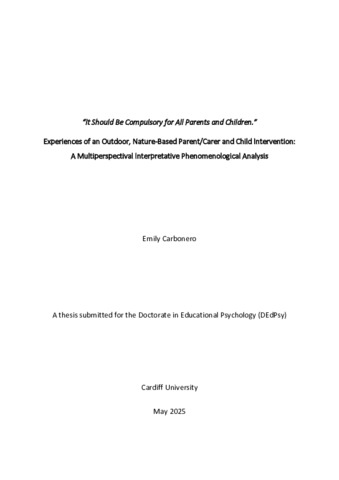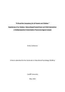 The aim of this study was to explore the experiences and perceptions of two facilitators and five PCs who had taken part in an outdoor, nature-based PC and child intervention with a focus on relationships. The researcher interviewed two facilitators and five PCs who took part in the intervention from November to December 2023. IPA (Smith et al., 2021) was adopted throughout the study, informing the use of semi-structured interviews focused on the participants’ retrospective perceptions and experiences of the intervention. Following immersion into the researcher’s interpretation of each participant’s data, group themes for each participant group were created. This was followed by consideration of the space between the findings of the two groups through a multiperspectival IPA data analysis approach, giving voice to the rich, mutual meaning-making that occurs between individuals (Larkin et al., 2019). This resulted in the creation of four overarching themes; Strengthening the microsystem, Safe community, Risk versus freedom and Seeds of hope, ultimately emphasising nature’s contribution to the intervention and its potential use in future incentives. This is further discussed with relation to psychological theory and research, following which the strengths and limitations of the study are outlined and implications for educational psychologists (EPs), schools, families and wider systems and are considered, alongside avenues for future research.