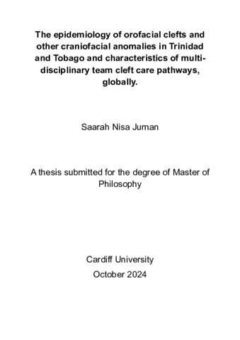 Introduction Orofacial clefts (OFCs) are the most prevalent craniofacial anomaly (CFA) worldwide, with birth prevalence varying significantly across different geographic regions and ethnic groups. In terms of management, there are also global disparities in the quality and access to comprehensive cleft care through a multidisciplinary (MDT) approach. This is reflected within Small Island Developing States (SIDS) like the Caribbean country, Trinidad and Tobago. Despite its high-income status and universal healthcare system providing free healthcare to its citizens, it faces specific healthcare challenges to other members of the United Nations’ SIDS such as a lack of specialised professionals, infrastructure and quality health services such as a national cleft service. Moreover, the Caribbean, often grouped with Latin America as “Latin America and the Caribbean (LAC)”, is frequently overlooked by international non-profit organisations focused on developing cleft care within low-middle income countries in South and Central America, leaving Caribbean countries with higher income status without similar support. This lack of international influence and interest in developing care for cleft patients within the Caribbean is thought to be at least in part due to the absence of up-to-date epidemiological evidence. Updating the evidence on the epidemiology of orofacial clefts and craniofacial anomalies in Trinidad and Tobago is therefore expected to enhance both local and international efforts aimed at improving cleft care in the country and across the Caribbean region. Additionally, in an ambition to map the characteristics of a cleft care pathway appropriate for introducing a MDT approach to comprehensive cleft care that is sustainable and scalable in low-resource settings such as Trinidad and Tobago and other SIDS, a scoping review approach to systematically reviewing the literature is deemed appropriate. This work supports the United Nation’s Sustainable Development Goals, specifically targets 3.8 and 3.C in achieving access to essential healthcare services and increasing health development in developing countries especially in SIDS. iii Aims and objectives The overall aims of this thesis were to: 1) Explore the epidemiology of orofacial clefts (OFCs) and other craniofacial anomalies in Trinidad and Tobago; and 2) Appraise the literature on MDT care pathways for the management of patients with OFCs globally and use the information found to suggest characteristics of a care pathway appropriate for introducing basic MDT cleft care in low-resource settings that is sustainable and scalable. To achieve this, the objectives were to: 1. Determine the birth prevalence (incidence) of orofacial clefts and other craniofacial anomalies in Trinidad and Tobago and explore associated factors that might be linked to these anomalies through an epidemiological study following a cross-sectional, retrospective, quantitative, observational design. 2. Identify the characteristics of an ideal MDT cleft care pathway and facilitating factors and challenges to its implementation; and 3. Define characteristics of a basic, sustainable MDT cleft care pathway that can be implemented. Methods The aims and objectives were addressed through two pieces of work. The first was an epidemiological study with an observational quantitative cross-sectional design, over a 5-year retrospective period (2018-2022). Birth prevalence was determined using data extracted from Trinidad and Tobago’s digital national birth registry database. The numbers of craniofacial anomalies identified in the database for the country’s different Regional Health Authorities (RHAs) were verified through searching a variety of data sources including hospital files/records and nursing admission notes at each RHA’s Neonatal Intensive Care Unit (NICU) during that period. To explore the evidence-based associated risk factors that might be linked to OFCs, hospital records of babies and their mothers were searched. For each baby iv identified as being born with an OFC, a healthy newborn closely matched (by sex and birth month) was randomly selected within the same RHA to form study and control groups. Birth prevalence and the samples were presented using descriptive statistics. Logistic regression models were used to assess which factors are more strongly linked with the birth of a baby with an OFC. The second was a scoping review conducted following the Joanna Briggs Institute (JBI) guidelines. To identify eligible sources of evidence, multiple electronic databases were searched along with hand-searching for grey literature. Only data sources focused exclusively on the management (which includes both diagnosis and treatment from all clinical specialities) of non-syndromic orofacial cleft were considered. Studies were screened by two independent reviewers using the pre-determined eligibility criteria and any disagreements resolved with a third (experienced) reviewer. Results The birth prevalence of the most common craniofacial anomaly, orofacial clefts, within the population of Trinidad and Tobago was found to be 0.64 per 1000 births. Other craniofacial anomalies were poorly reported as only 3 cases of micrognathia were reported by a single RHA. This study also encountered missing data and inconsistently available and ambiguous data suggesting that record-keeping needs improvement and optimisation in the areas of patient history documentation, craniofacial anomaly surveillance and orofacial cleft classification. Although only a limited number of variables were appropriate for analysis, significant predictors of OFCs were still identified (gestational age; birth weight; birth length; maternal age; maternal medical history within normal limits; gravida; para). This study’s findings suggest that the likelihood of a birth with an OFC decreases with gestational age, birth weight, birth length and if there is a maternal medical history within normal limits.