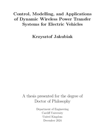 Uncontrolled Keywords: | 1. Dynamic Wireless Power Transfer (DWPT) 2. Wireless Power Transfer (WPT) 3. Electric Vehicles (EV) 4. Inductive Power Transfer (IPT) 5. Average modelling 6. Power electronics control 7. Coil design and misalignment 8. Vehicle-to-Grid (V2G) 9. Charging infrastructure |