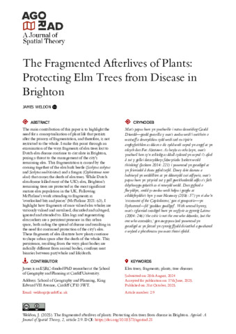 The main contribution of this paper is to highlight the need for a conceptualisation of plant life that persists after the process of fragmentation, and therefore, is not restricted to the whole. I make this point through an examination of the ways fragments of elm trees lost to Dutch Elm Disease continue to circulate in Brighton, posing a threat to the management of the city’s remaining elm. This fragmentation is caused by the coming together of the elm bark beetle (Scolytus scolytus and Scolytus multistriatus) and a fungus (Ophiostoma novo-ulmi) that causes the death of elm trees. While Dutch Elm Disease killed most of the UK’s elm, Brighton’s remaining trees are protected as the most significant mature elm population in the UK. Following McFarlane’s work attending to fragments as ‘overlooked bits and pieces’ (McFarlane 2021: 63), I highlight how fragments of once valued elm wholes are variously valued and unvalued, discarded and salvaged, ignored and attended to. Elm logs and regenerating elm suckers are a persistent presence in this urban space, both aiding the spread of disease and resulting in the need for continued protection of the city’s elm. These fragments of elm illustrate how plants continue to shape urban space after the death of the whole. This persistence, resulting from the ways plant bodies are radically different from animal bodies, confuses neat binaries between part/whole and life/death.