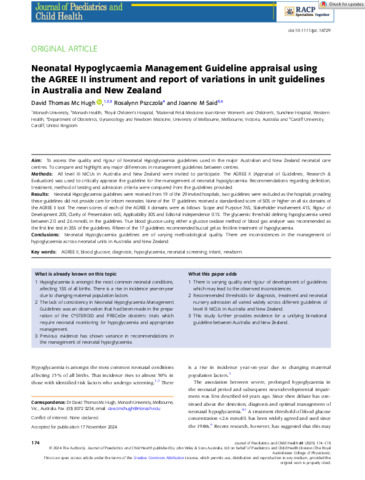 Neonatal Hypoglycaemia Management Guideline appraisal using the AGREE II instrument and report of variations in unit guidelines in Australia and New Zealand.