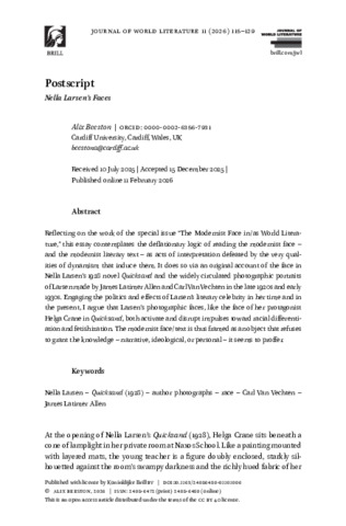 Reflecting on the work of the special issue “The Modernist Face in/as World Literature,” this essay contemplates the deflationary logic of reading the modernist face – and the modernist literary text – as acts of interpretation defeated by the very qualities of dynamism that induce them. It does so via an original account of the face in Nella Larsen’s 1928 novel Quicksand and the widely circulated photographic portraits of Larsen made by James Latimer Allen and Carl Van Vechten in the late 1920s and early 1930s. Engaging the politics and effects of Larsen’s literary celebrity in her time and in the present, I argue that Larsen’s photographic faces, like the face of her protagonist Helga Crane in Quicksand, both activate and disrupt impulses toward racial differentiation and fetishization. The modernist face/text is thus framed as an object that refuses to grant the knowledge – narrative, ideological, or personal – it seems to proffer.