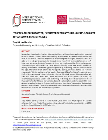 Researchers investigating Scarlett Johansson’s films and image have neglected an essential strand of the star’s career. Scholars have mostly demonstrated no interest in Johansson’s film noirs. In this article, I offer one step forward in correcting this oversight. Johansson’s four noir roles point to a larger tendency in her film output: the noirs firmly position Johansson as an A-list actress with a specific type of star vehicle. In her noirs and many of her films in other genres, Johansson plays a role in which the character must also play a role, wear a mask, or hide her identity (or identities). I name this type of role performing performing. Film noir is well suited for this type. The femme fatale often hides her agenda, identity, or motive behind the feminine masquerade. With the assistance of star studies theories and Mary Ann Doane’s observations on the feminine masquerade in twentieth century cinema, this article turns to Johansson’s four noir roles and offers two theses. First, while Johansson acts across genres and styles, she nevertheless possesses a specific trait, performing performing, that cuts across her work and thus establishes her films as star vehicles. Second, analysing her performances in film noirs demonstrates how her twenty-first century films diverge from Doane’s accounts of the twentieth century’s femme fatales. This article intervenes in ongoing debates about gender representation, stardom, and performance in contemporary cinema.